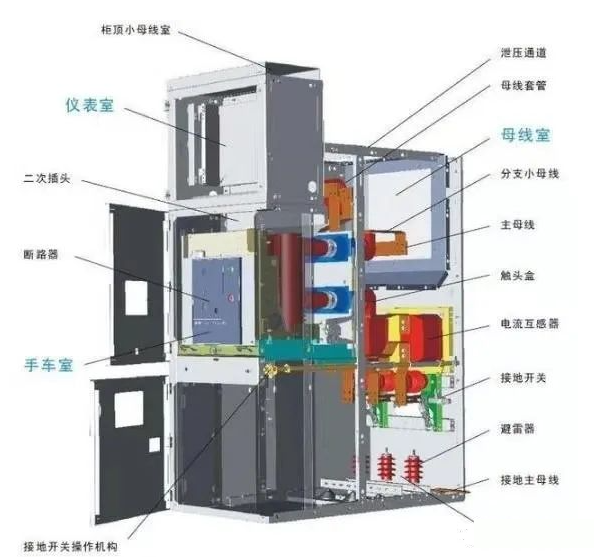 PT柜內(nèi)有測量PT和計量PT(原來要求是要分開測量PT和計量PT,如沒有特殊要求也可以不分開,可以共用)。頂部的小母線可用于向其他高壓柜提供電源。同時為其它設(shè)備提供電源,滿足測量、計量和保護(hù)電源的電壓要求。